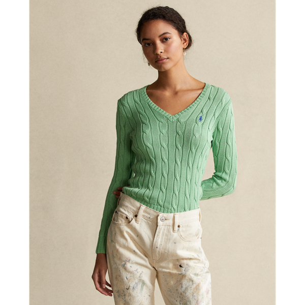 Der robuste und praktische Polo-Pullover mit dem legendären, von Fischerseilen inspirierten Zopfmuster hat sich zu einem Symbol für den College-Stil entwickelt. Diese Version aus weicher Baumwolle präsentiert sich mit schmaler Silhouette und V-Ausschnitt.