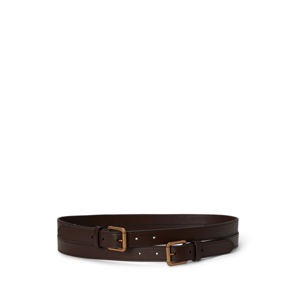 Dieser elegante breite Gürtel aus geschmeidigem Narbenleder, das sich durch seine natürlich glatte Oberfläche auszeichnet, besticht durch seine gestapelte Silhouette mit zwei Eindornschnallen aus Metall.