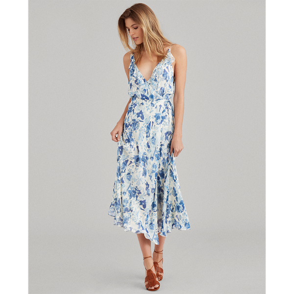 Dieses Kleid mit dem Aquarell-Blumenmuster der Saison in der für Polo Ralph Lauren charakteristischen Palette aus Blau- und Weißtönen präsentiert sich leger mit einem tiefen V-Ausschnitt mit Rüschen auf der Rückseite, mit dem Sie ein wenig Haut zeigen können.