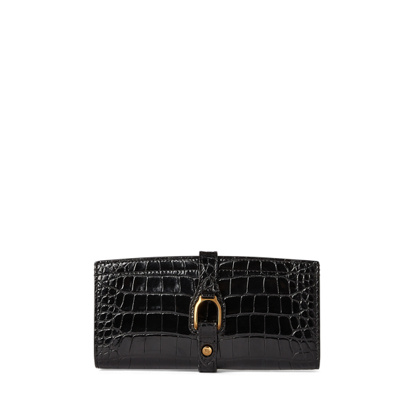 Einzelheiten- Der Riemen aus Alligatorleder ist um die Brieftasche geschlungen, durch eine goldfarbene Steigbügelschnalle geführt und schließt mit einem Druckknopfverschluss. Schnalle mit „Ralph Lauren“-Gravur auf beiden Seiten. Goldfarbener Druckknopf mit „RL“-Gravur.