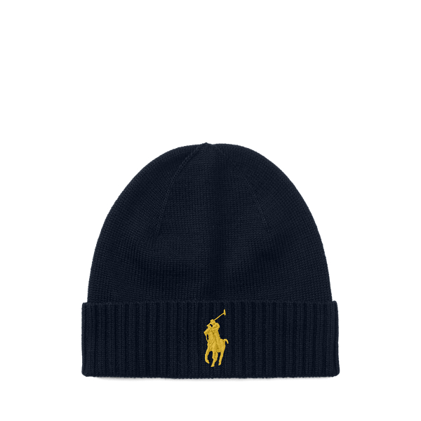 Diese weiche Strickmütze präsentiert sich am Umschlag mit unserem charakteristischen gestickten Pony aus goldfarbenem Garn.