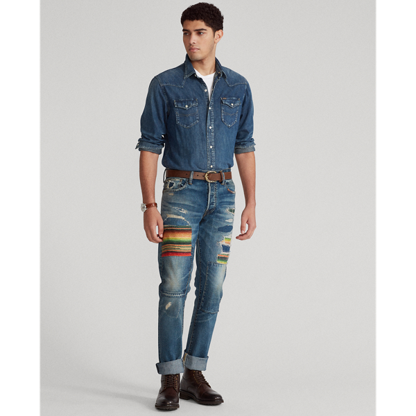 Die Hose Varick mit normaler Leibhöhe und geradem Bein liegt am Oberschenkel eng an und wird ab dem Knie weiter. Diese nicht dehnbare Hose kombiniert japanischen Denim mit kontrastierenden Aufnähern für einen einzigartigen, künstlerischen Touch.