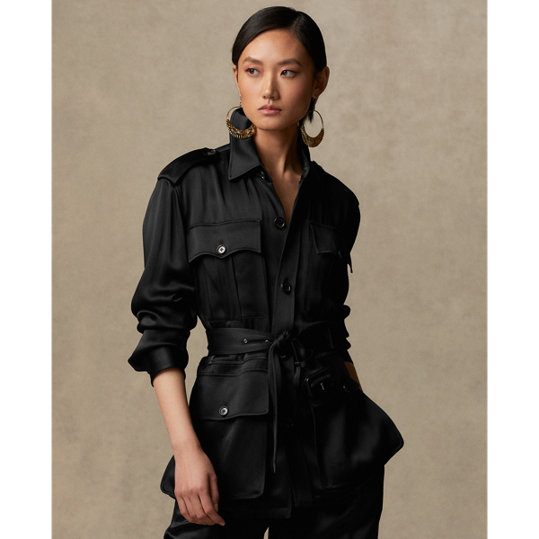 Inspired by clothes with a sense of purpose and utility, Mr. Lauren reimagines one of his most enduring designs: the safari jacket. This rendition of the Tasha is crafted from a double-faced satin that is woven in a storied Italian mill and lends a remarkable drape and a subtle yet luxurious sheen. A bevy of authentic details, like buttoned-flap patch pockets, buttoned shoulder epaulets, and a waist-clinching self-belt elevated by a lamb-suede–covered buckle, complete this Italian-made style.