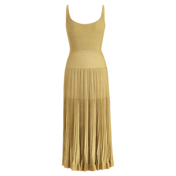 Dieses kontrastierende Trägerkleid beeindruckt durch zwei unterschiedliche Strukturen: ein feines Rippstrickmuster kombiniert mit edlen Falten. Die tollen Akkordeon-Falten am Rock sehen aus wie Plissee- bzw. Messerfalten, entstehen allerdings durch die spezielle Rippstricktechnik. Dieser in Italien aus sehr feinem Garn gefertigte Style mit einem Hauch von Metallic-Glanz verkörpert den angesagten Gold-Look.