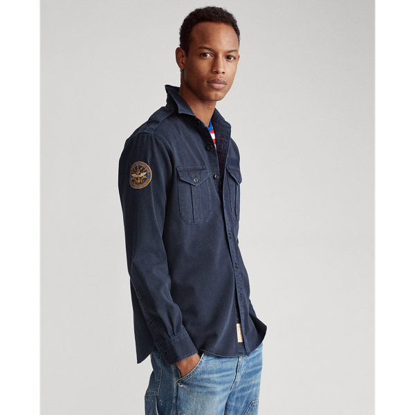 Dieses Hemd, das von Vintage-Seemannsbekleidung inspiriert wurde, kombiniert strapazierfähigen Baumwolltwill und charakteristische Aufnäher, darunter ein „R. Lauren“-Namensschild.