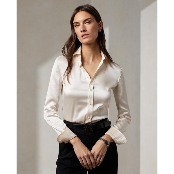 The Cameron draws inspiration from the first women's shirt Ralph Lauren designed in 1971, and is updated in a lustrous silk charmeuse fabric with a hint of stretch. Made in Italy, this shirt is designed with a button-down point collar, double pleats at each cuff, and genuine mother-of-pearl buttons.