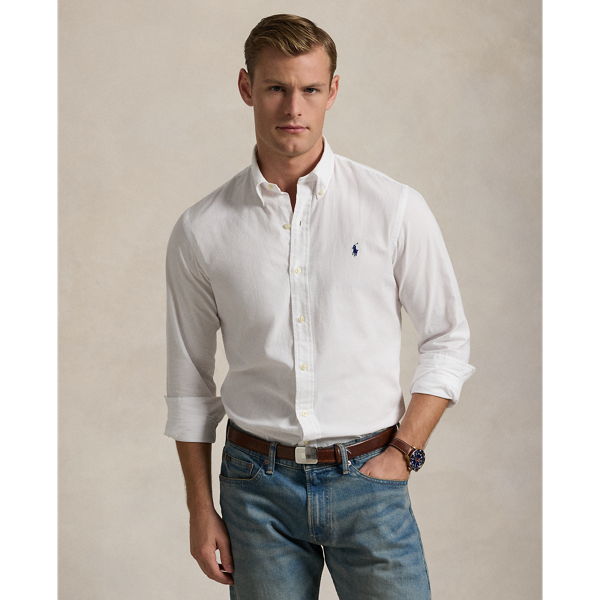 This Custom Fit shirt is crafted from lightweight, breathable cotton seersucker and features our signature embroidered Pony on the chest.