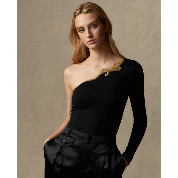 Utilising a jersey stitch construction, this one-shoulder jumper is crafted from Italian-spun mulberry silk infused with a hint of stretch for an elegant body-contouring fit. The stunning style's asymmetrical neckline is beautifully decorated with one of Ralph Lauren's most enduring emblems: a gecko, which is uniquely hand-embellished with a collection of faceted stones.