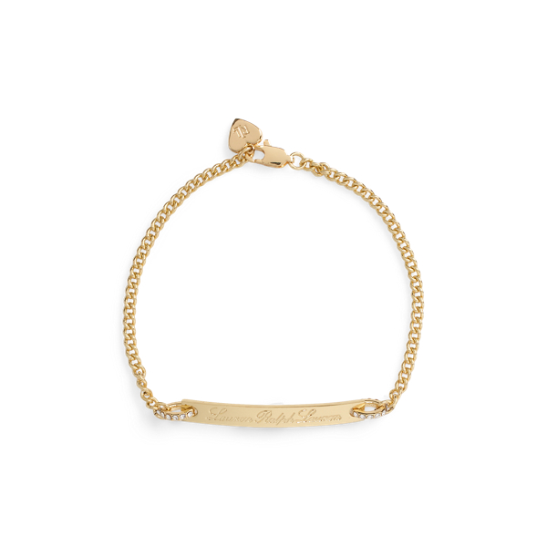 This refined 14K gold-plated bracelet features a “Lauren Ralph Lauren”-engraved logo bar anchored to its cable chain with two glistening pavé-set rings.