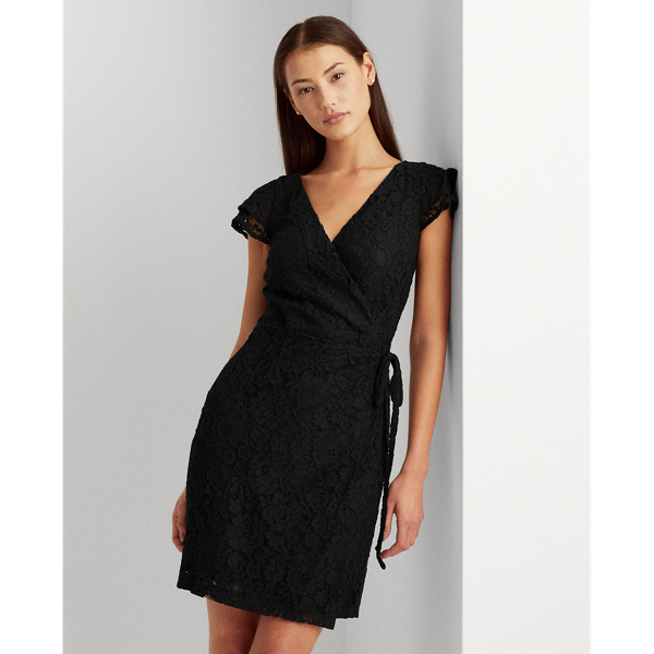 With a surplice neckline and a draped overlay at the skirt, this slim-fitting faux-wrap dress is constructed from romantic lace with whimsical flutter sleeves.