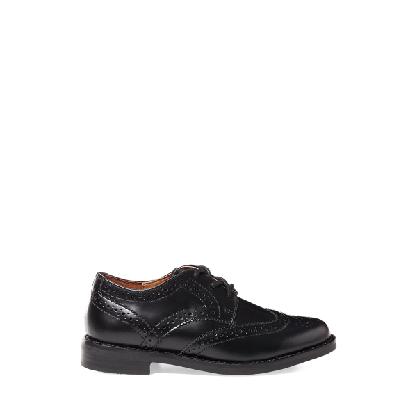 This tumbled leather wingtip oxford is a smaller version of a men's Polo Ralph Lauren style. Accented with serrated-edge trim and intricate perforations, it looks sharp when paired with dress trousers in any season.