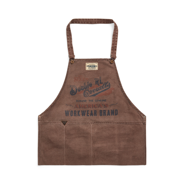 Made with workwear-inspired cotton canvas. Logo graphic printed on the front. Adjustable overall-strap construction with American-made, rust-finished metal buttons on the chest. Self-ties at the back of the waist. Leather triangular reinforcement on the front right pocket. Copper-tone rivets. Washed, tinted and distressed for a vintage look.