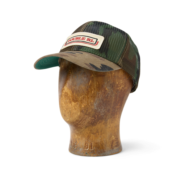 Camo mesh trucker cap. Ripstop bill. Custom-embroidered logo patch on the front inspired by an original Double RL ball cap from 1993. Signature green underbill. Adjustable back strap.