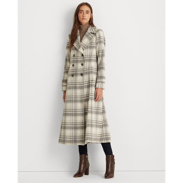 "Lauren Ralph Lauren"-engraved horn-effect buttons elegantly finish this calf-grazing wool-blend coat. A chic plaid print offers timeless appeal.