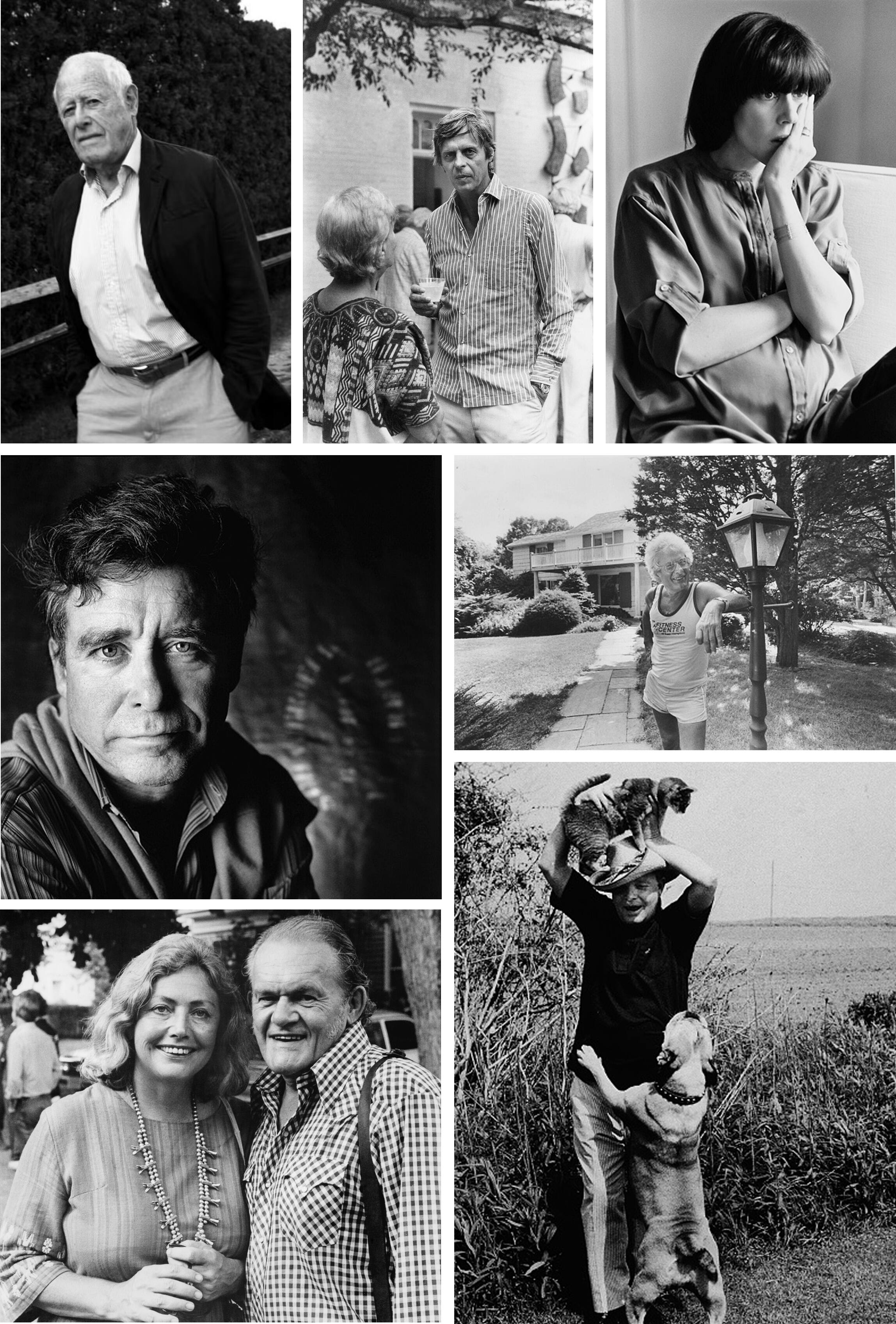 Clockwise, from top: James Salter, George Plimpton, Nora Ephron, Joseph Heller, Truman Capote, James and Gloria Jones, Jay McInerney.