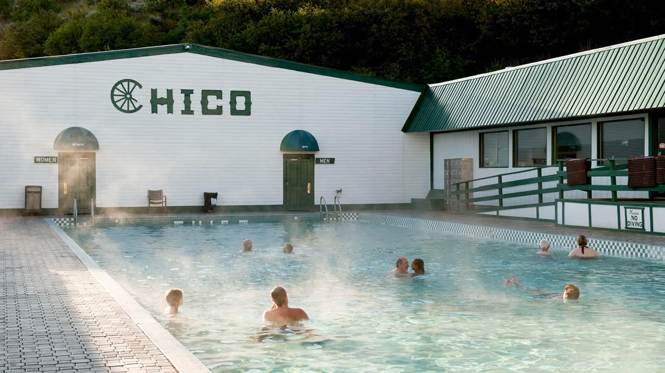 The hotel has the welcome sleepiness of a large country house. When you arrive in the day, it might feel empty—everybody’s out on the trail or the water. It feels like it’s been around forever (it opened in 1900). There are simple rooms in the main lodge (the shower’s down the hall). I prefer the rustic wooden cabins—a few narrow beds, hooks in the wall, which is really all you need. It reminds me of other fishing lodges and my family’s cabin back in Wisconsin. The saloon is dark and not quite a dive; it’s a place you’d rather have a beer than an artfully stirred martini. I’ve met people there—we started talking about fishing—and the next thing I know, it’s after midnight and we were passing around a flask. The hot springs themselves are best when the temperature drops and you soak as the air cools and you can forget about the trout you lost that day. There’s a window where you order drinks without having to go back inside—and there’s usually a line, which gives you a sense of the celebratory feeling. At Chico, everybody’s in a good mood and feels like they’re in the right place.
