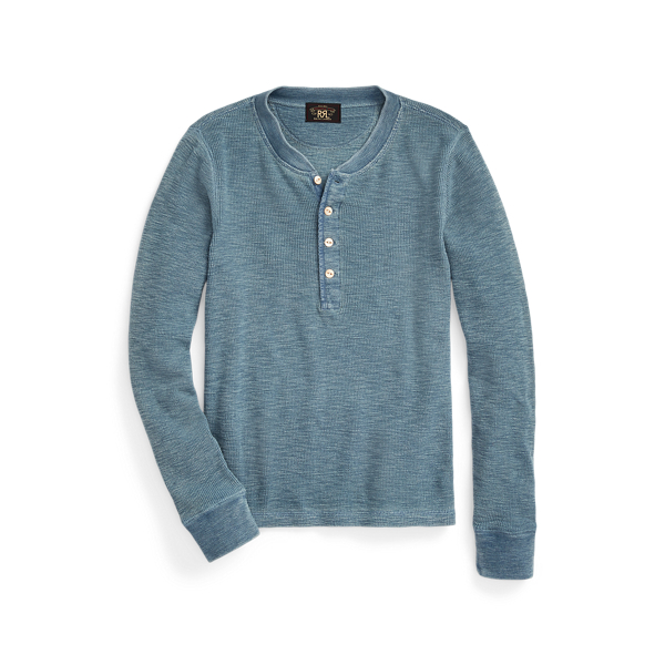 Henley made from stretch-cotton waffle fabric. Finished with fish-eye river-shell buttons. Dyed with true indigo.