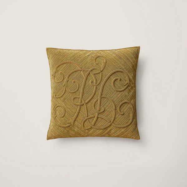 Ce superbe coussin arbore une broderie zardozi faite main devant révélant un motif élaboré à broderie bullion du monogramme Ralph Lauren en fil métallisé doré. Le riche motif texturé est doublé de velours uni sur l'envers.