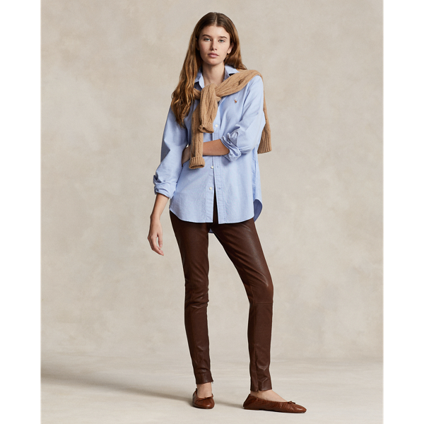 Ce pantalon en cuir d'agneau luxueux possède des coutures collées plutôt que cousues pour une coupe skinny flatteuse. Zippez les fentes d'aisance dissimulées sur l'ourlet pour un look allongeant la jambe ou portez-les ouvertes sur des bottes.
