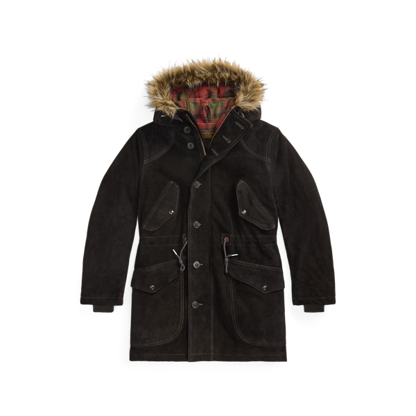 Confectionné en cuir de vache suédé. Bordure en fausse fourrure sur la capuche. Rembourrage en duvet synthétique léger et isolant. Le corps et la capuche sont doublés de sergé écossais de laine mélangée. Poches en chamois gratté. Zip en laiton créé en exclusivité avec le logo Double RL. Boutons en ivoire végétal.