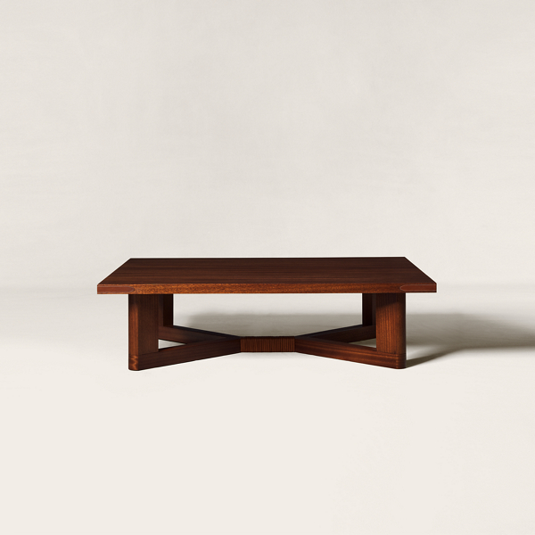 La collection Thayer revisite avec une touche moderne l'univers équestre, une source d'inspiration pour les designs de M. Lauren depuis toujours. Véritable hommage à la qualité et au savoir-faire de la sellerie anglaise raffinée, la table basse est confectionnée en cerisier avec de somptueux dégradés sur l'ensemble du grain. La silhouette basse possède un piétement croisé sculptural recouvert de cuir et des finitions en forme d'extrémité de ceinture à chaque coin.